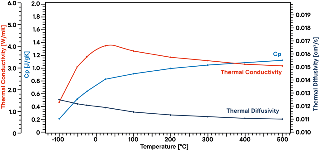 LFA L51 可直接测定该样品热扩散系数随温度变化的函数关系。通过对该样品和已知标准玻璃陶瓷进行同步对比测量,获得了比热容数据。基于密度、比热容和热扩散系数的乘积关系计算得出导热系数。结果显示:随着温 度升高,热扩散系数和导热系数呈轻微下降趋势,而比热容则持续上升。